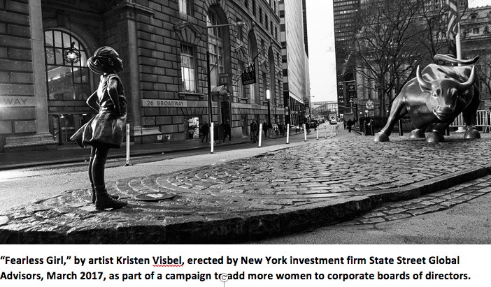 State Street Global Advisors is an investment firm which manages $2.5 trillion in assets. It unveiled the statue as the launch of a campaign to add more women to corporate boards of directors. (Apparently, surveys have found deep resistance to the idea that women should comprise even 50 percent of a board, with 53 percent of directors surveyed responding that women should comprise no more the 40 percent of board membership.)